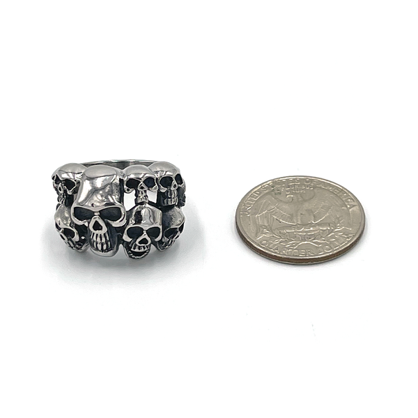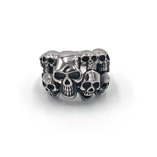 Show off the remains of your killed opponents with the Skull Pile ring that has been carefully crafted with intricate details. This piece serves as the perfect addition to your collection that can be worn daily without worry of any green skin or metal corrosion.