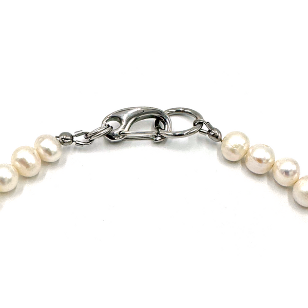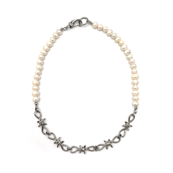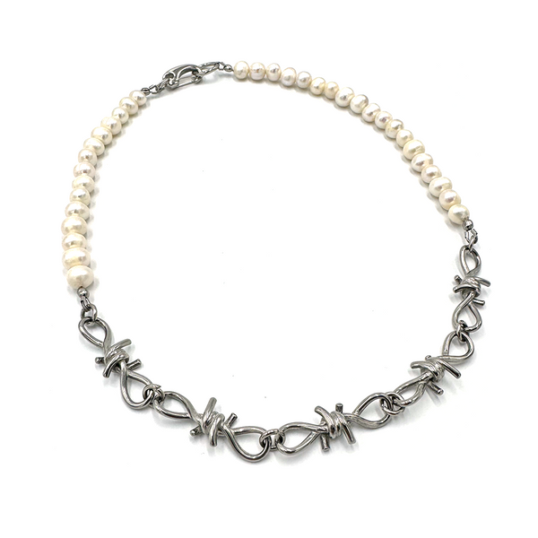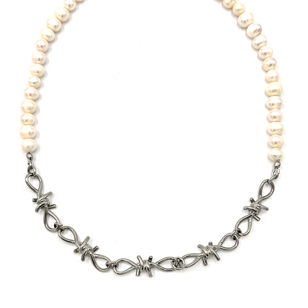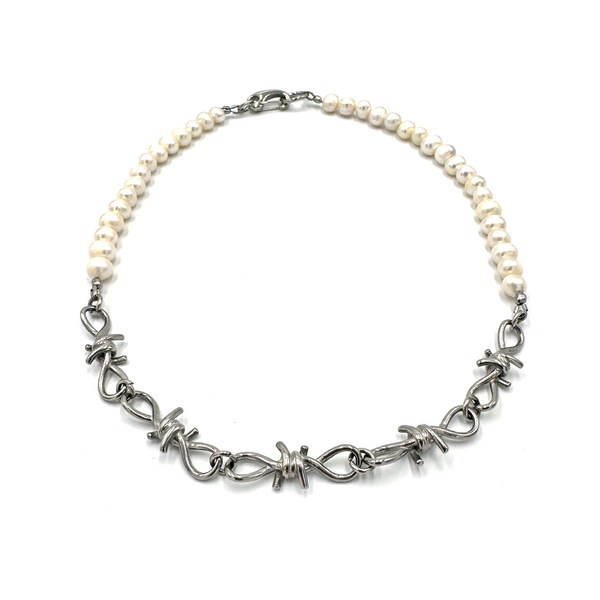 The Volition necklace strikes the perfect balance of elegance and boldness, making it ideal for a single-layered look. Crafted with meticulously strung pearls on flexible steel wire and paired with a barbed wire stainless steel chain, this piece exudes unique sophistication. It’s an irresistible statement accessory, perfect for elevating any outfit