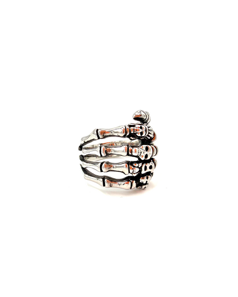 The Deathgrip Ring captures raw intensity with its sculpted skeletal hand design wrapping tightly around the finger. Crafted from oxidized stainless steel, it features detailed bone textures and darkened creases for a hauntingly realistic finish. Bold and uncompromising, this piece embodies power, mortality, and rebellion in one striking form.