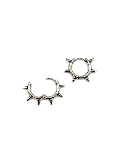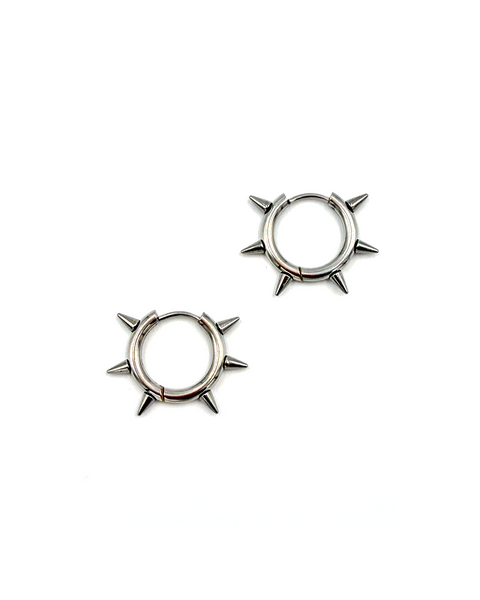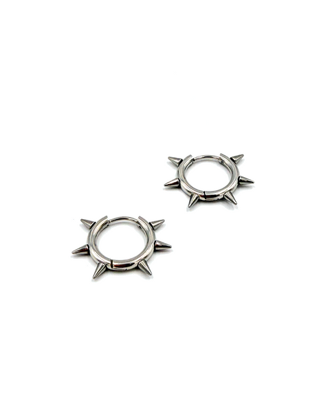 The Halo Blade Earrings are crafted from polished stainless steel and feature a circular silhouette lined with precision-cut spikes. Their bold, symmetrical design delivers a clean yet aggressive statement. Built for versatility, they bring a sharp, modern edge to any look.